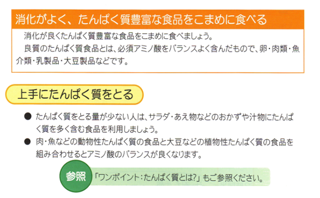 消化がよく,たんぱく質豊富な食品をこまめに食べる